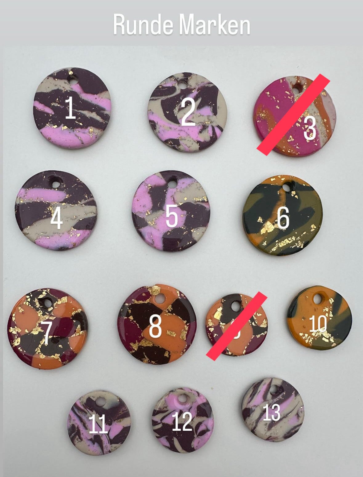 Die Marken bestehen aus von mir gestaltetem und handgeformtem Polymerclay und einer Versiegelung aus Epoxidharz.