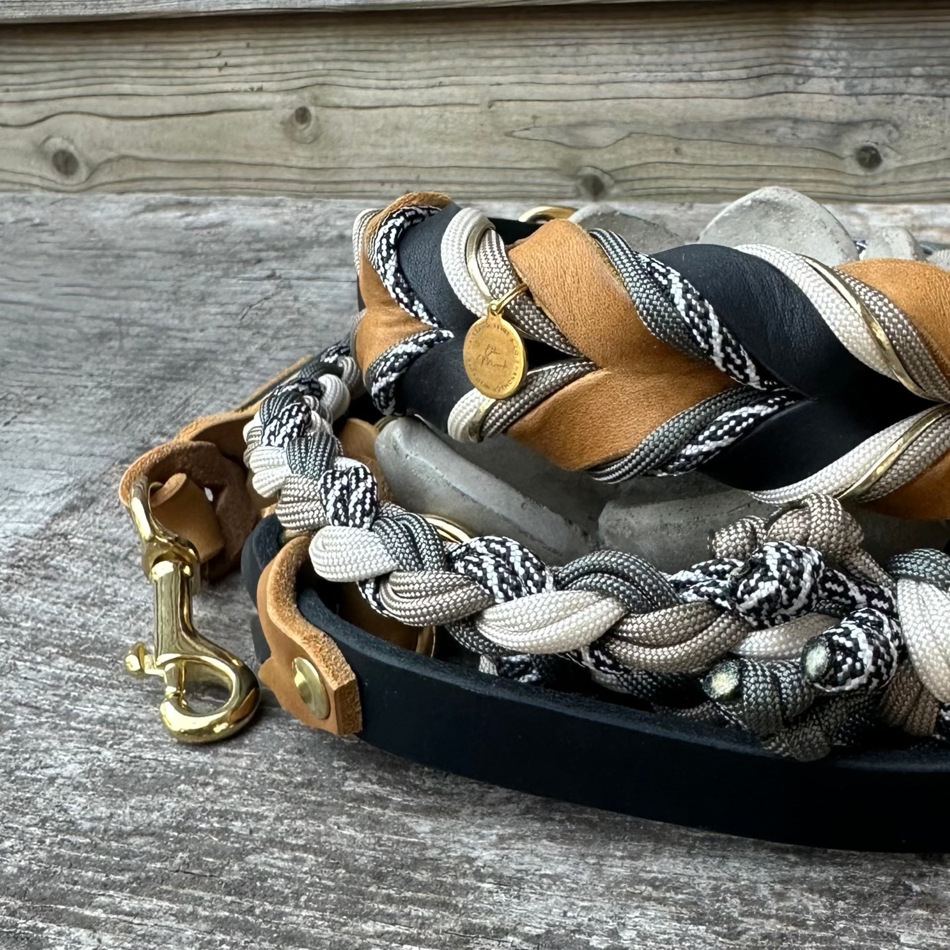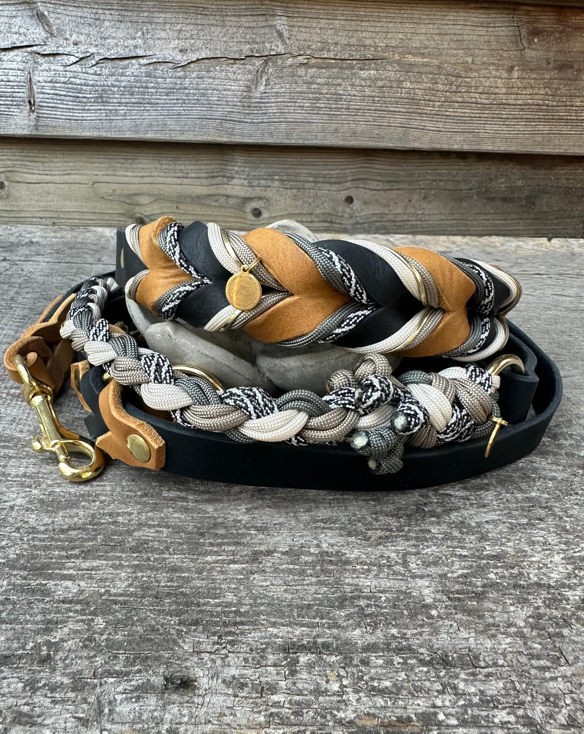 Das Halsband mit 4fach Paracord in dunklen Naturtönen gehalten und eine 3-fach verstellbare Kombileine aus Leder und rund geflochtenem Paracord. Dazu hochwertige Beschläge aus Messing