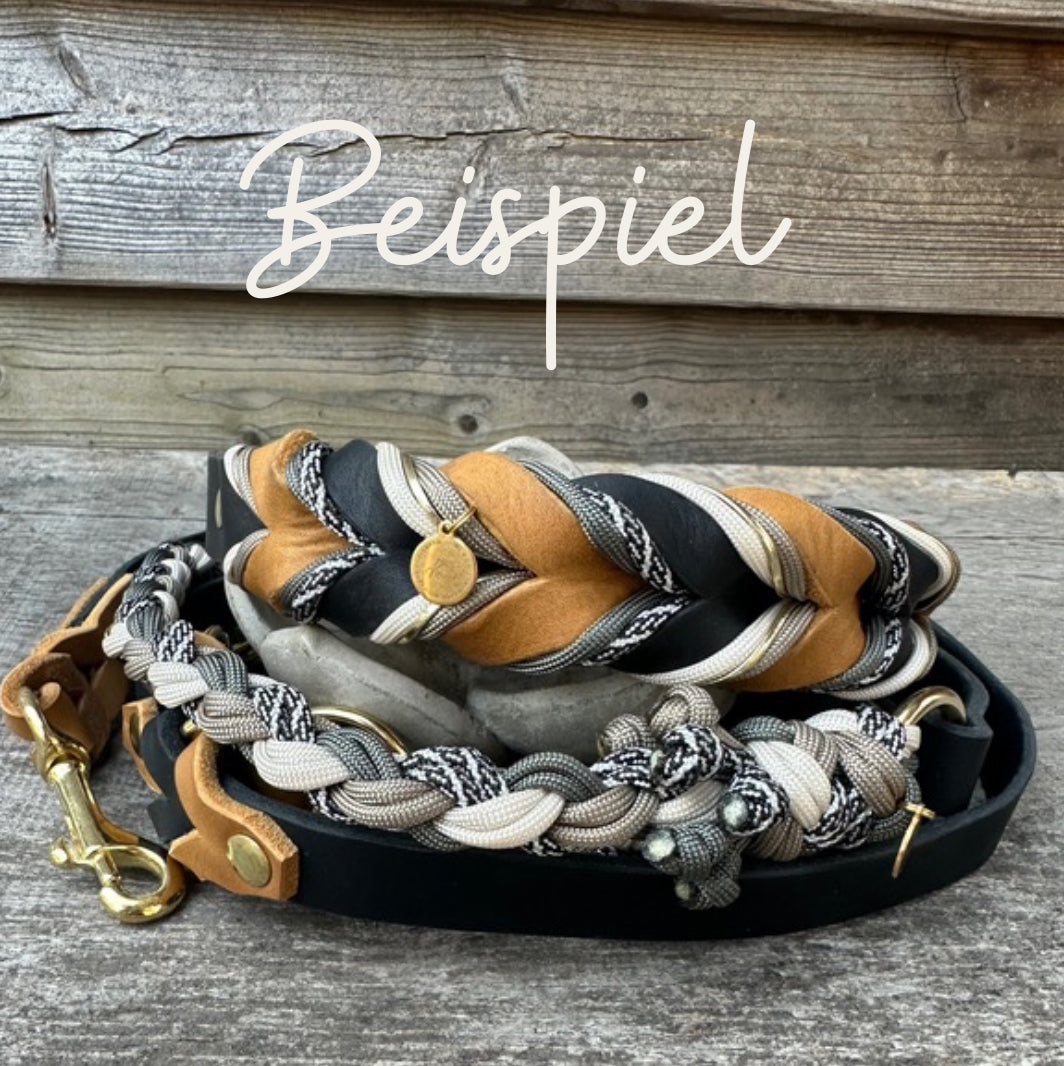 Die Farben sowie die Variante des Halsbandes und der Leine sind festgelegt und können NICHT geändert werden. Auf dem zweiten Bild siehst du welche Art Halsband und Leine es wird. Die Leine ist 2m lang und kann 3x verstellt werden.