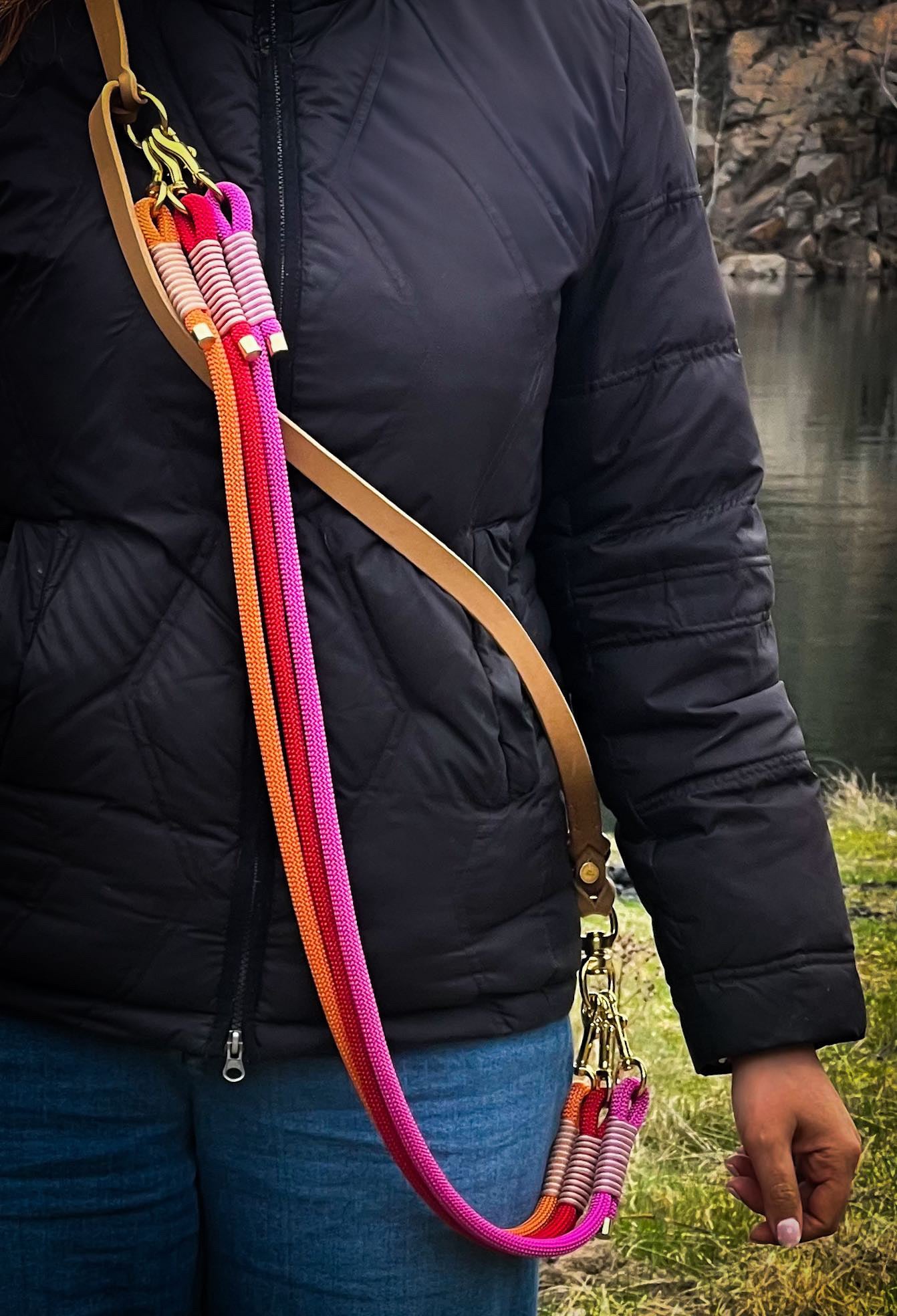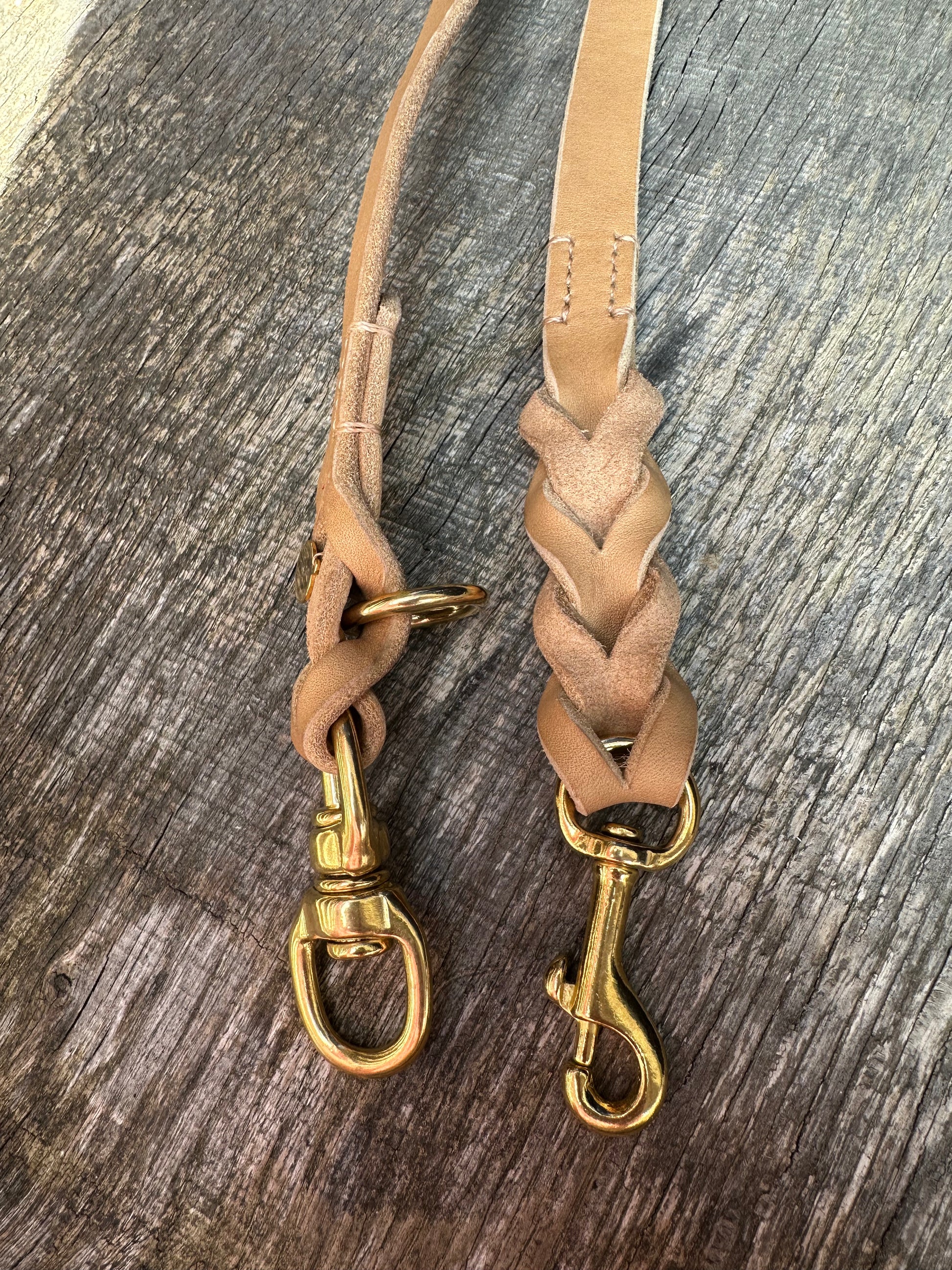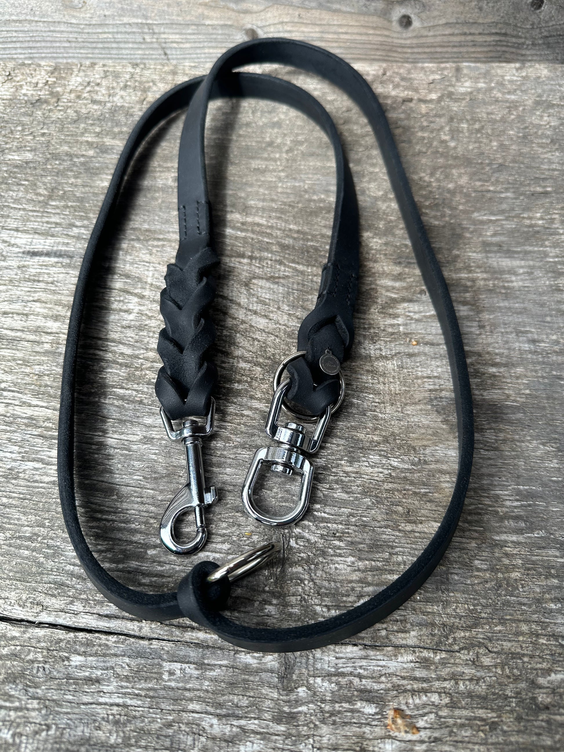 Du kannst zwischen einem langen Lederteil, welches du zweimal verstellen und auch easy umhängen kannst oder einer Handschlaufe wähle und hast ca. eine Leinenlänge von 1,30m. An der Handschlaufe befindet sich ein Ring an dem du die alle Koppelstücke befestigen kannst. So ist auch diese Leine im Freilauf umzuhängen.