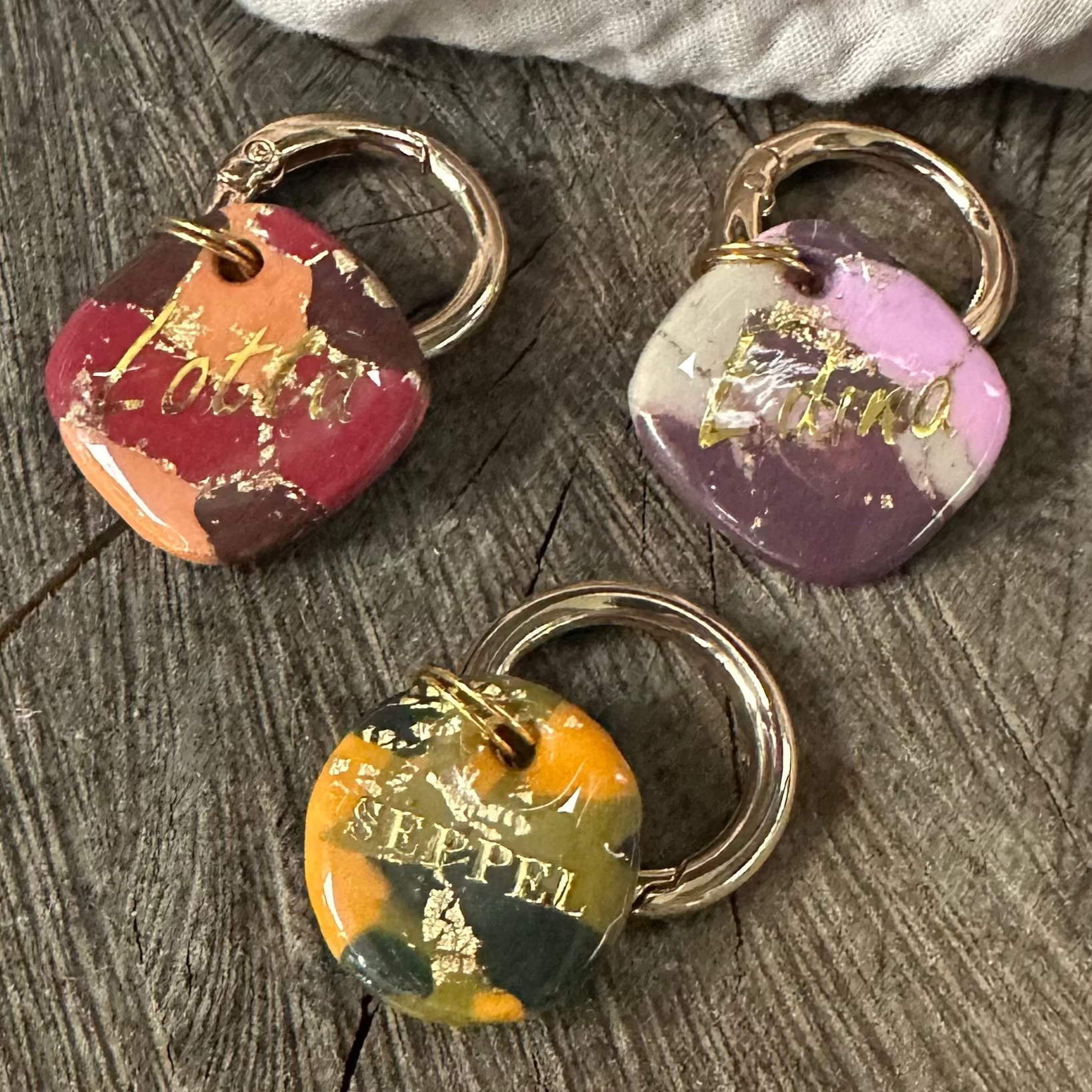 Die Marken bestehen aus von mir gestaltetem und handgeformtem Polymerclay und einer Versiegelung aus Epoxidharz.