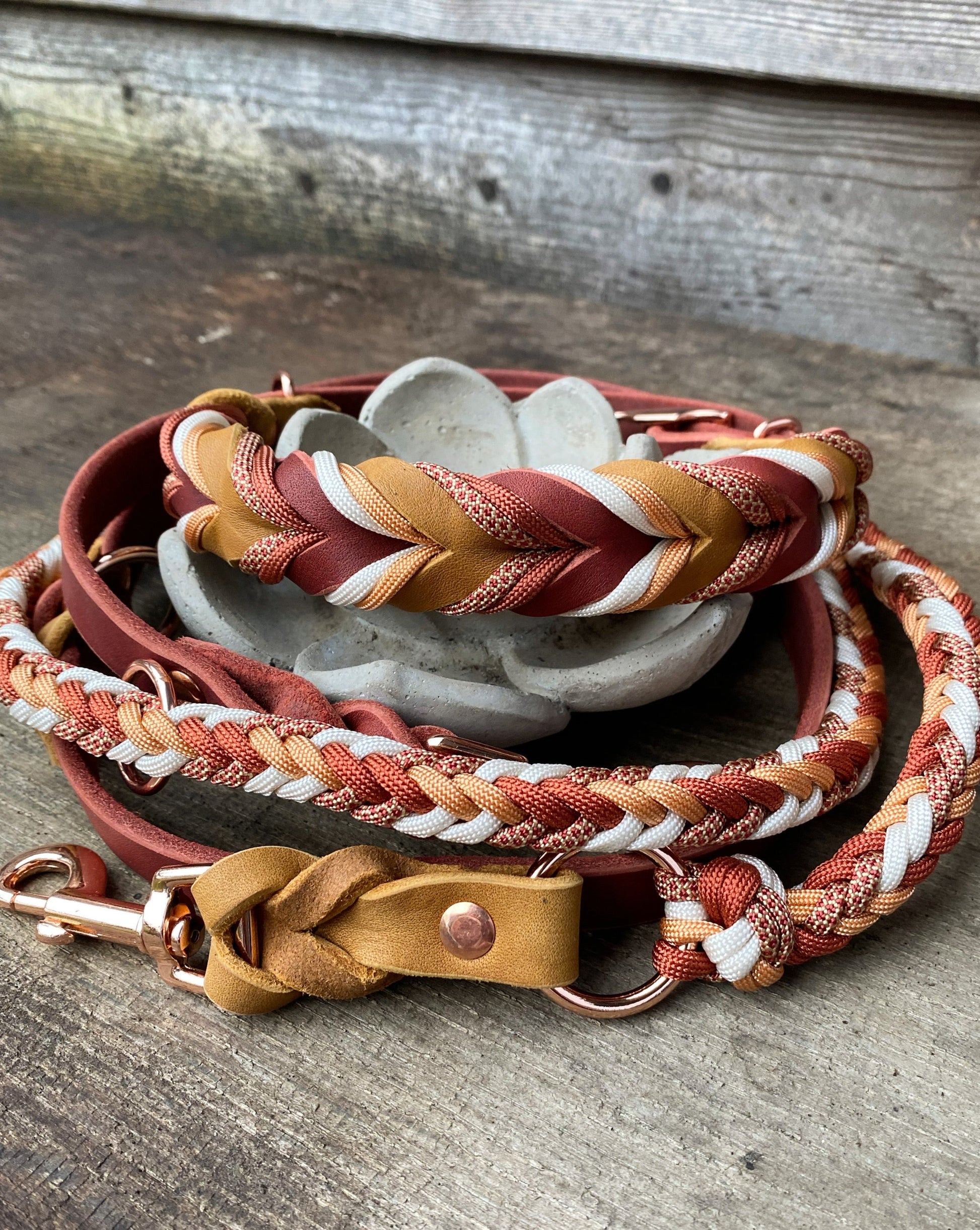Das Halsband mit 4fach Paracord in tollen Herbstfarben und eine 3-fach verstellbare Kombileine aus Leder und eckig geflochtenem Paracord. Dazu hochwertige Beschläge aus Messing