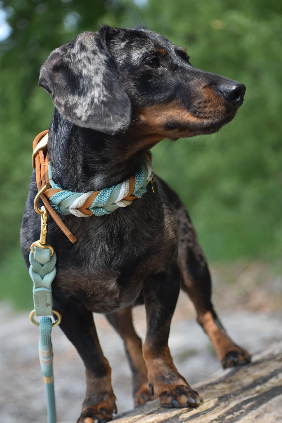 Das Set besteht aus einem Fettlederhalsband und im Set mit einer Leder/Tau Kombileine.