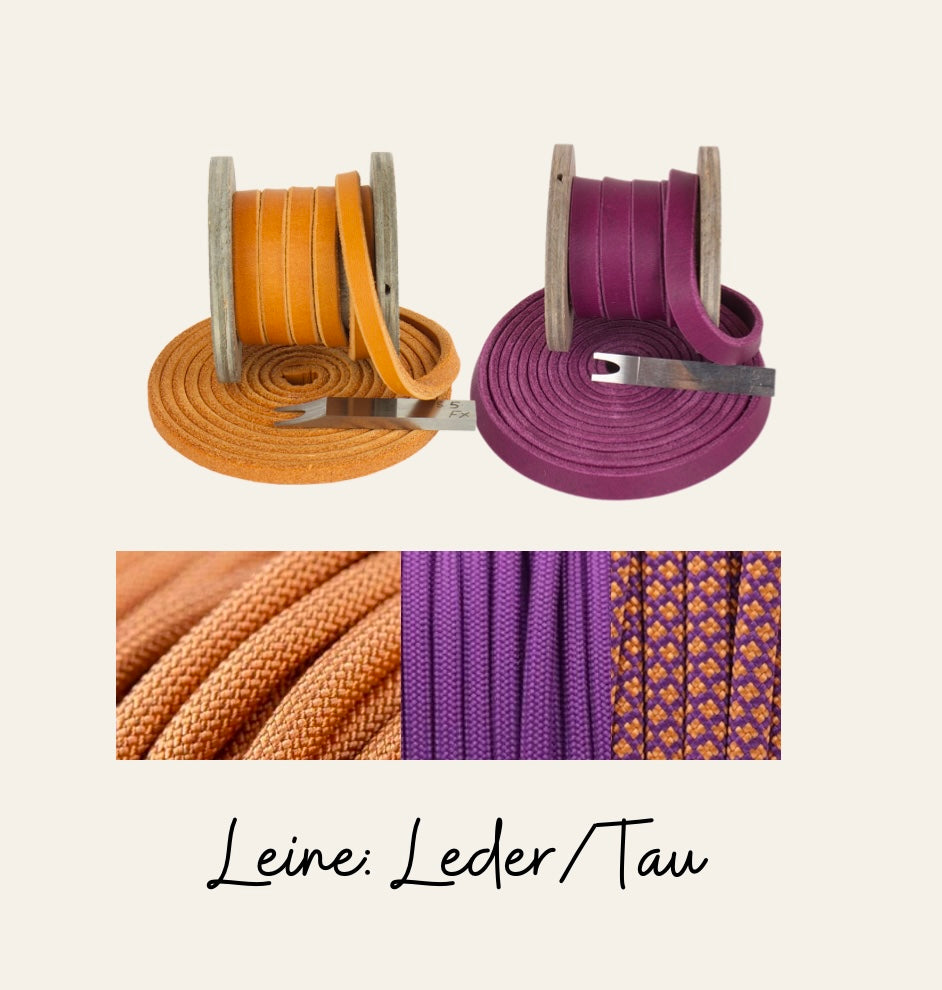 Die Farben sowie die Variante des Halsbandes und der Leine sind festgelegt und können NICHT geändert werden. Auf dem zweiten Bild siehst du welche Art Halsband und Leine es wird. Die Leine ist 2m lang und kann 3x verstellt werden.